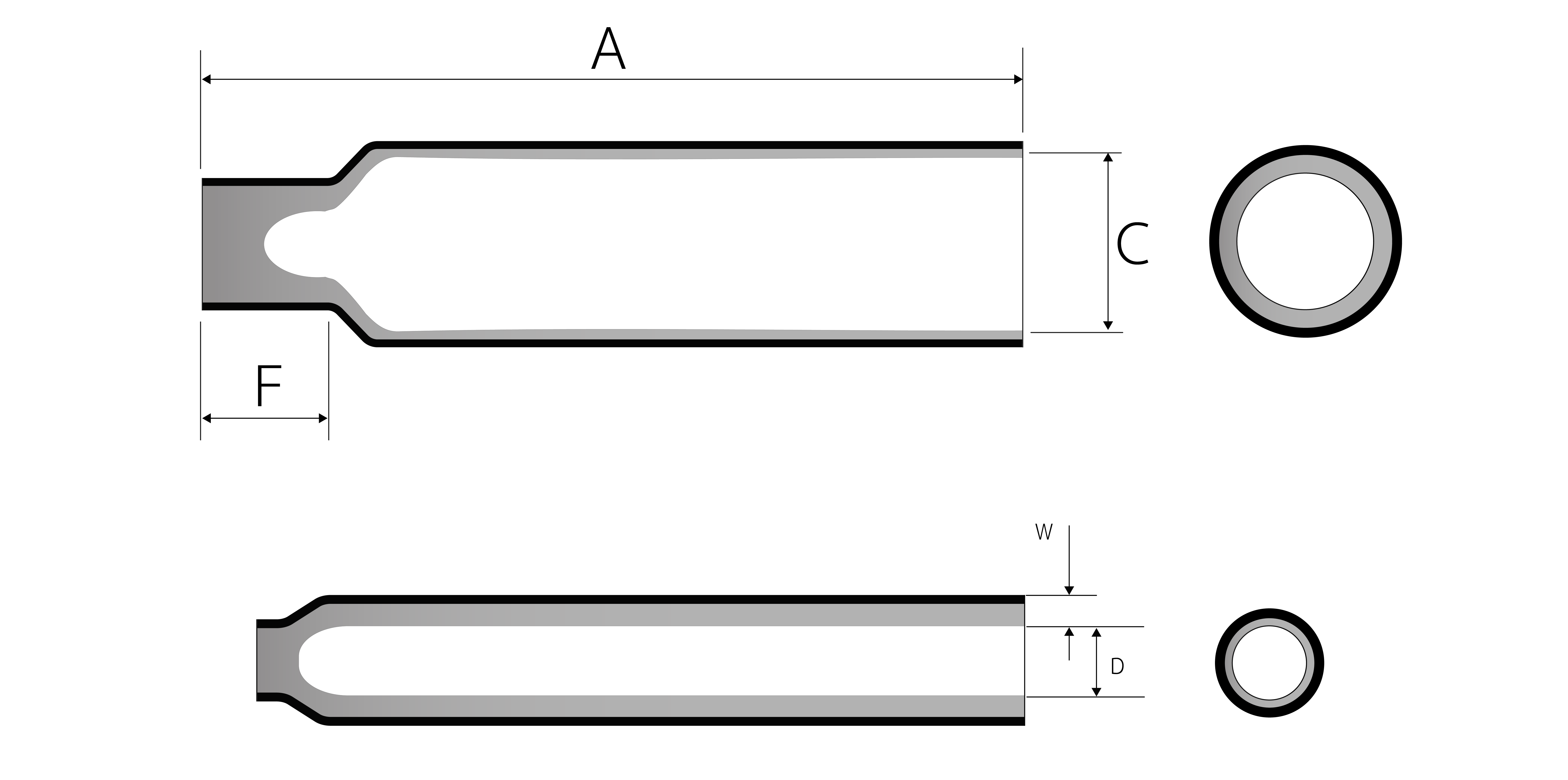 | เส้นผ่านศูนย์กลางภายใน ต่ำสุด (C) | ความยาวก่อนหด ต่ำสุด (F) | เส้นผ่านศูนย์กลางภายใน สูงสุด (D) | ความหนาผนังรวม (W) | |||